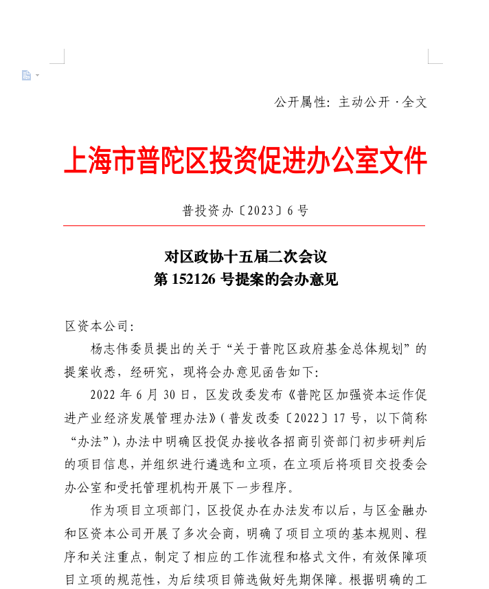 2022年6月30日,区发改委发布《普陀区加强资本运作促进产业经济发展管理办法》(普发改委〔2022〕17号,以下简称“办法”),办法中明确区投促办接收各招商引资部门初步研判后的项目信息,并组织进行遴选和立项,在立项后将项目交投委会办公室和受托管理机构开展下一步程序。