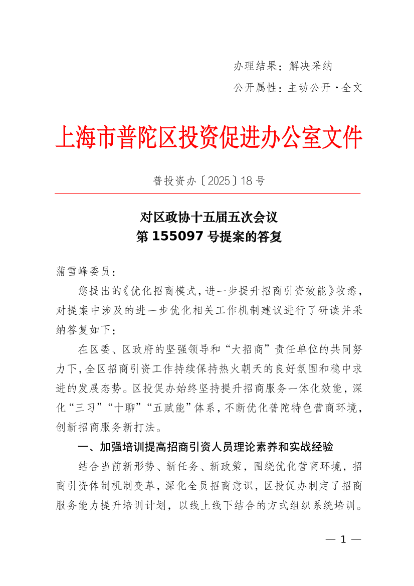 您提出的《优化招商模式,进一步提升招商引资效能》收悉,对提案中涉及的进一步优化相关工作机制建议进行了研读并采纳答复如下: