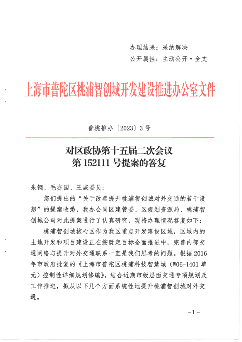 您们提出的“关于改善提升桃浦智创城对外交通的若干设想”的提案收悉,我办会同区建管委、区规划资源局、桃浦智创城公司对此提案进行了认真研究,现将办理情况答复如下:
