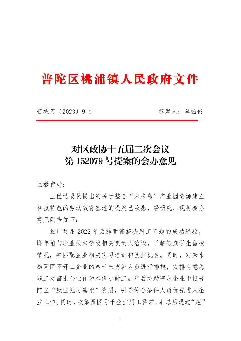 王世达委员提出的关于整合“未来岛”产业园资源建立科技特色的劳动教育基地的提案已收悉,经研究,现将会办意见函告如下: