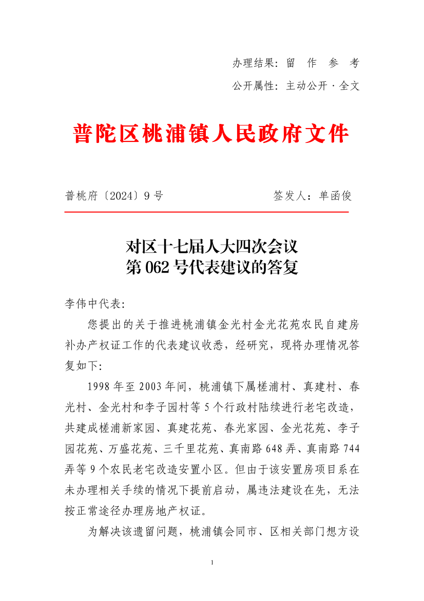 您提出的关于推进桃浦镇金光村金光花苑农民自建房补办产权证工作的代表建议收悉,经研究,现将办理情况答复如下: