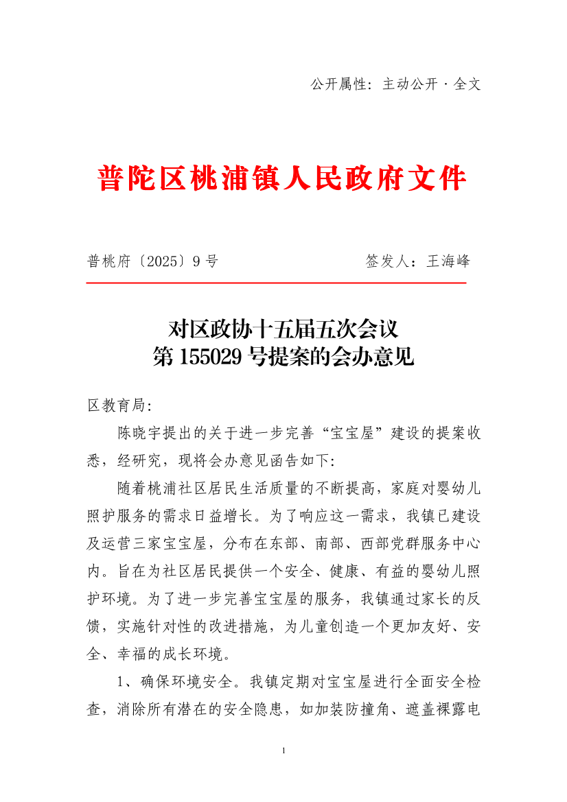 陈晓宇提出的关于进一步完善“宝宝屋”建设的提案收悉,经研究,现将会办意见函告如下: