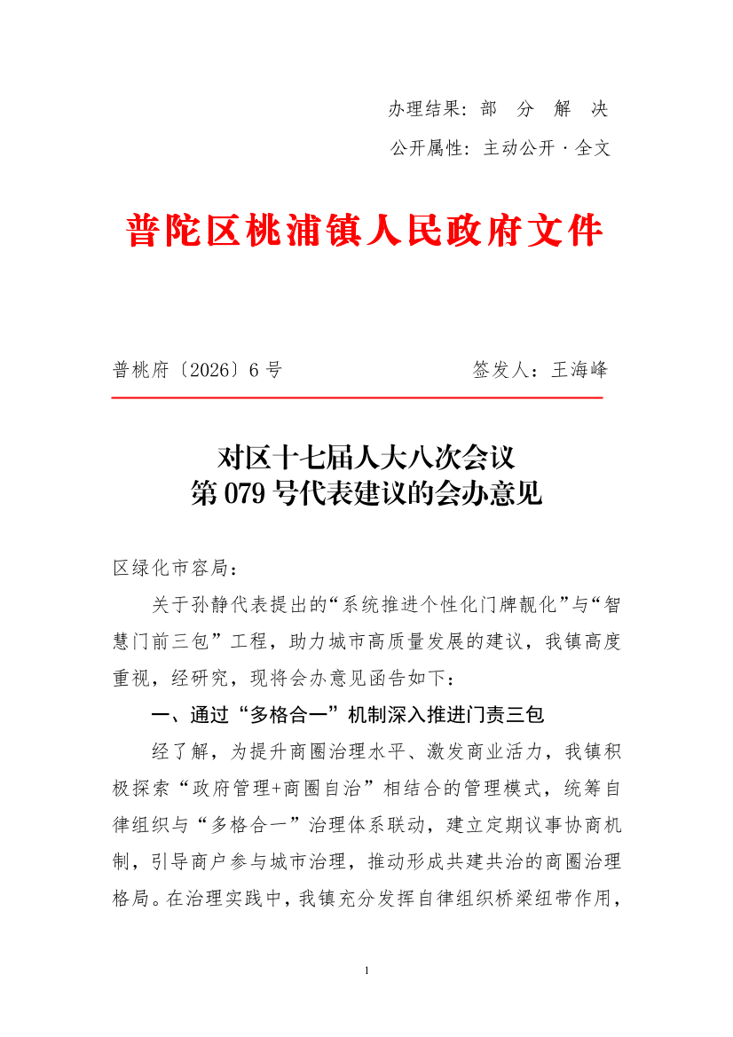 关于孙静代表提出的“系统推进个性化门牌靓化”与“智慧门前三包”工程,助力城市高质量发展的建议,我镇高度重视,经研究,现将会办意见函告如下: