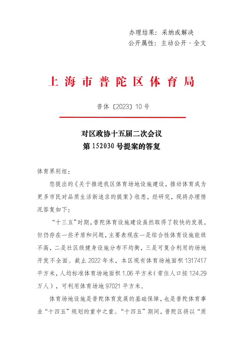 您提出的《关于推进我区体育场地设施建设,推动体育成为更多市民对品质生活新追求的提案》收悉,经研究,现将办理情况答复如下: