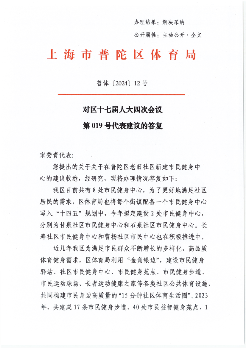 您提出的《关于在普陀区老旧社区新建市民健身中心的建议》收悉,经研究,现将办理情况答复如下: