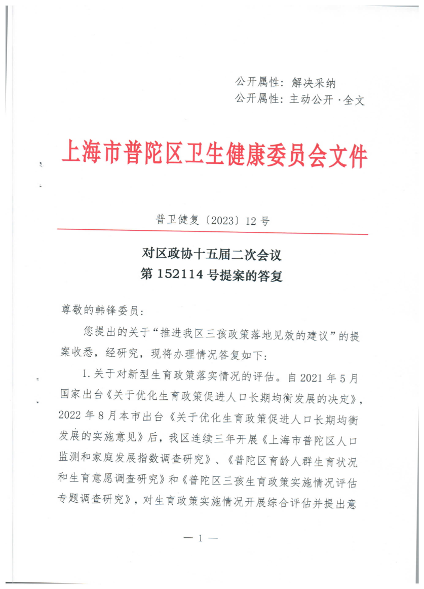 1.关于对新型生育政策落实情况的评估。自2021年5月国家出台《关于优化生育政策促进人口长期均衡发展的决定》,2022年8月本市出台《关于优化生育政策促进人口长期均衡发展的实施意见》后,我区连续三年开展《上海市普陀区人口监测和家庭发展指数调查研究》、《普陀区育龄人群生育状况和生育意愿调查研究》和《普陀区三孩生育政策实施情况评估专题调查研究》,对生育政策实施情况开展综合评估并提出意见建议,部分意见建议已转化为政策加以落实。