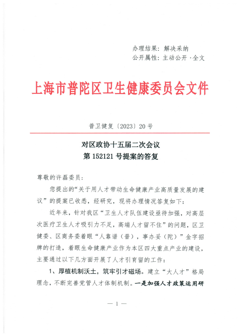 您提出的“关于用人才带动生命健康产业高质量发展的建议”的提案已收悉,经研究,现将办理情况答复如下: