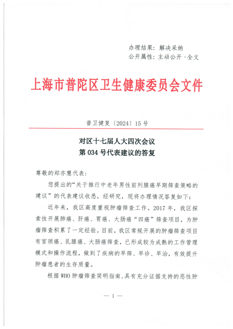 您提出的“关于推行中老年男性前列腺癌早期筛查策略的建议”的代表建议收悉,经研究,现将办理情况答复如下: