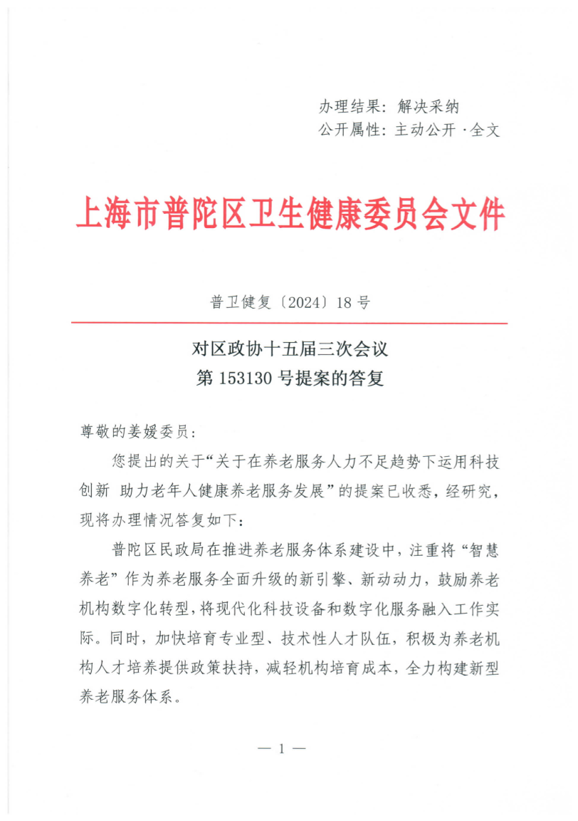 您提出的关于“关于在养老服务人力不足趋势下运用科技创新 助力老年人健康养老服务发展”的提案已收悉,经研究,现将办理情况答复如下: