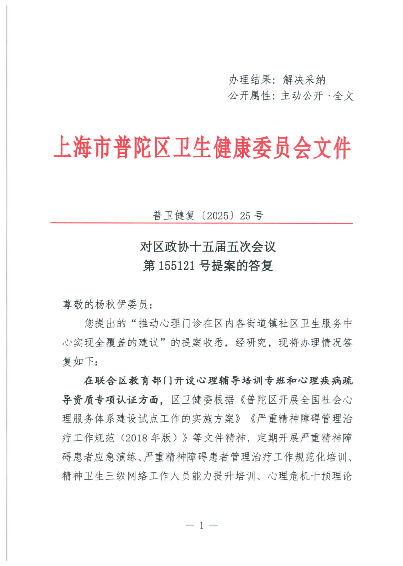 您提出的“推动心理门诊在区内各街道镇社区卫生服务中心实现全覆盖的建议”的提案收悉,经研究,现将办理情况答复如下: