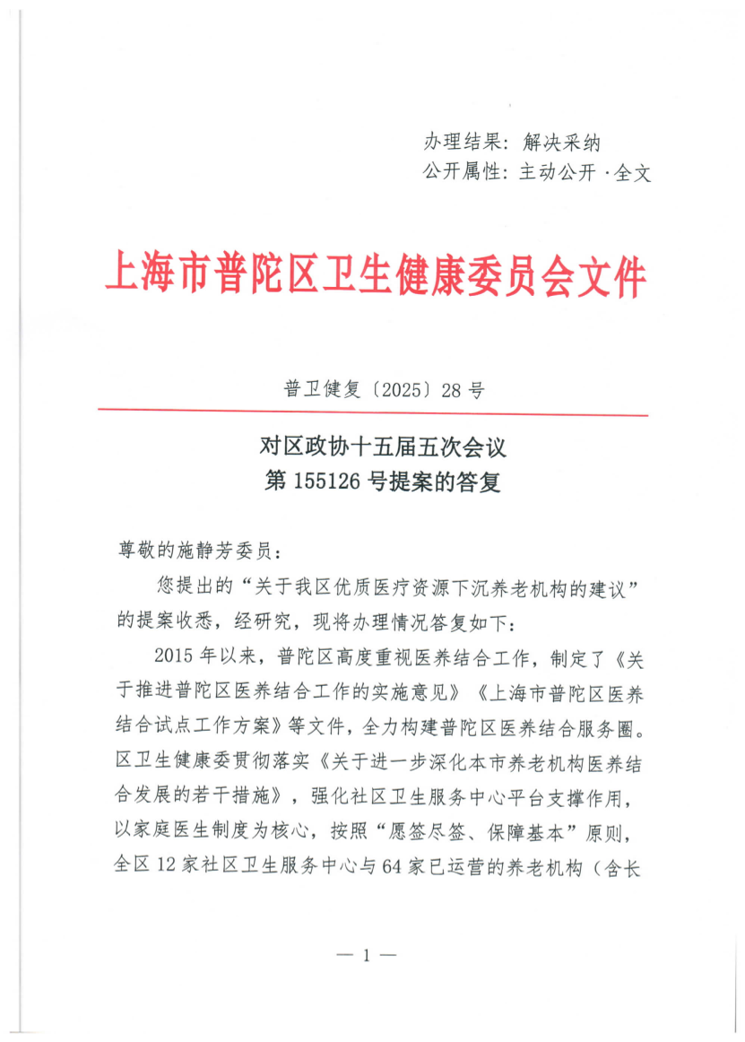您提出的“关于我区优质医疗资源下沉养老机构的建议”的提案收悉,经研究,现将办理情况答复如下: