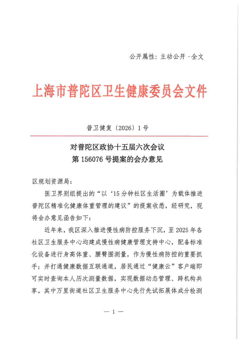 医卫界别组提出的“以‘15分钟社区生活圈’为载体推进普陀区精准化健康体重管理的建议”的提案收悉,经研究,现将会办意见函告如下: