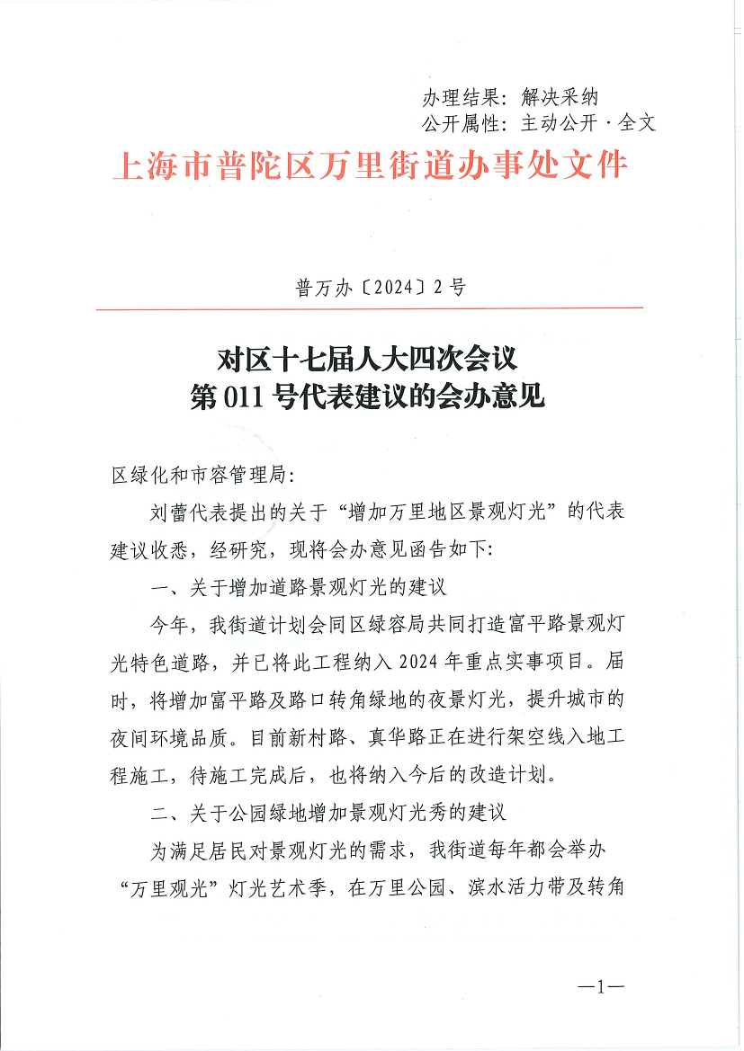 刘蕾代表提出的关于“增加万里地区景观灯光”的代表建议收悉,经研究,现将会办意见函告如下: