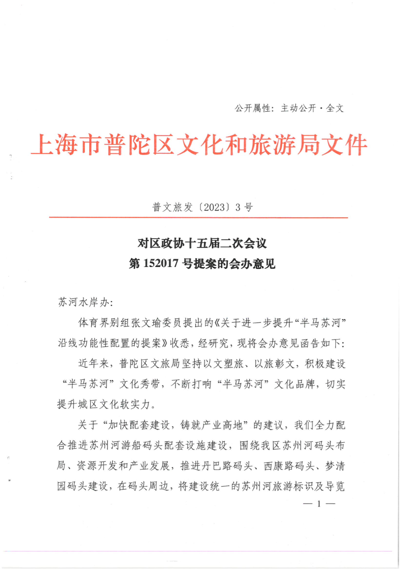 体育界别组张文瑜委员提出的《关于进一步提升“半马苏河”沿线功能性配置的提案》收悉,经研究,现将会办意见函告如下: