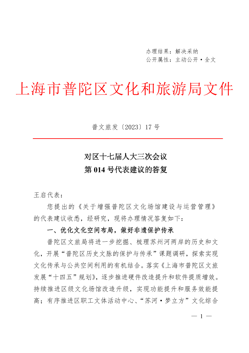 您提出的《关于增强普陀区文化场馆建设与运营管理》的代表建议收悉,经研究,现将办理情况答复如下: