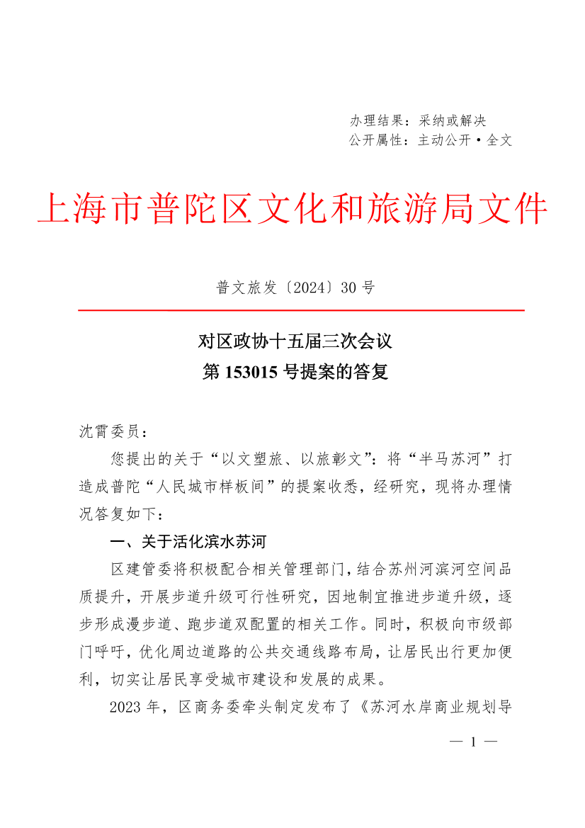 您提出的关于“以文塑旅、以旅彰文”:将“半马苏河”打造成普陀“人民城市样板间”的提案收悉,经研究,现将办理情况答复如下:
