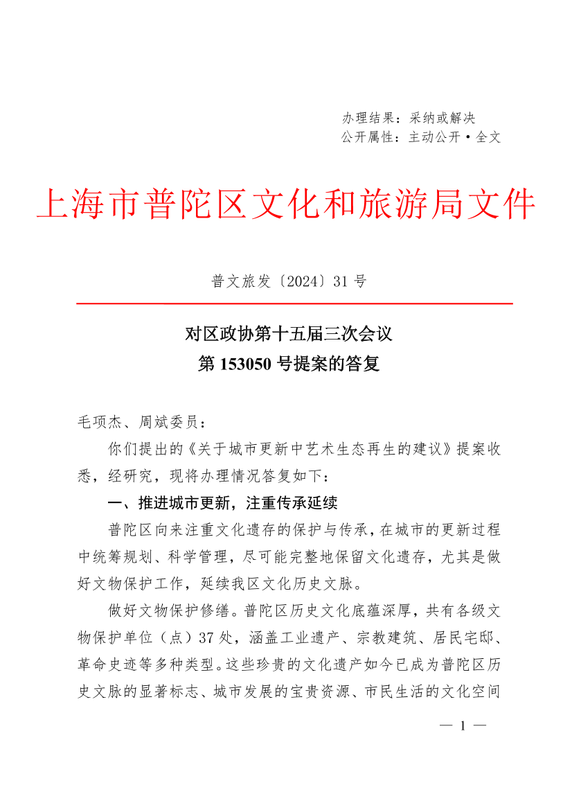 你们提出的《关于城市更新中艺术生态再生的建议》提案收悉,经研究,现将办理情况答复如下: