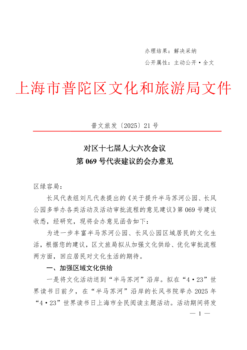 为进一步丰富半马苏河公园、长风公园区域居民的文化生活,根据您的建议,区文旅局拟从加强文化供给、优化审批流程两方面,回应居民对文化生活的期待。