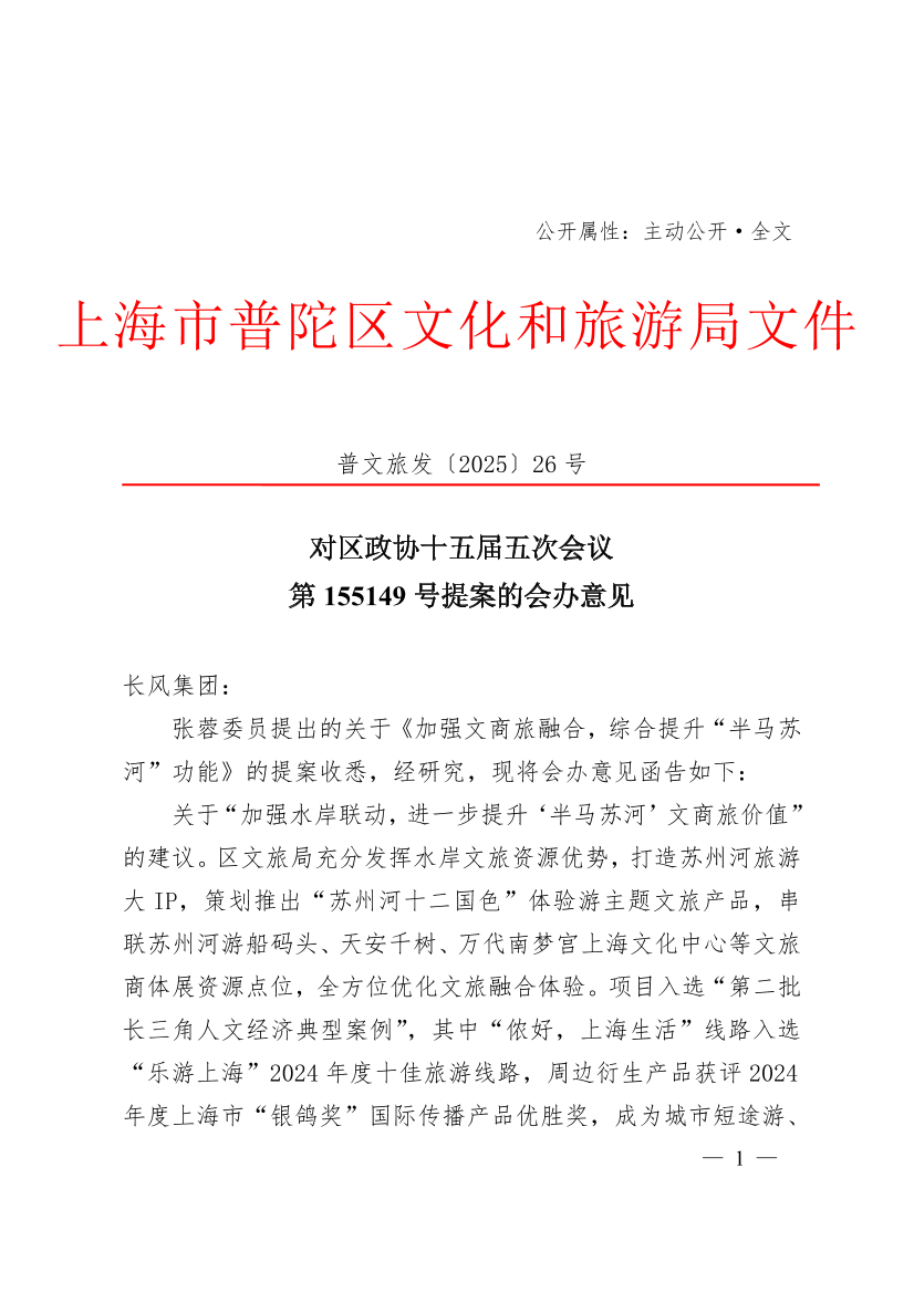 张蓉委员提出的关于《加强文商旅融合,综合提升“半马苏河”功能》的提案收悉,经研究,现将会办意见函告如下: