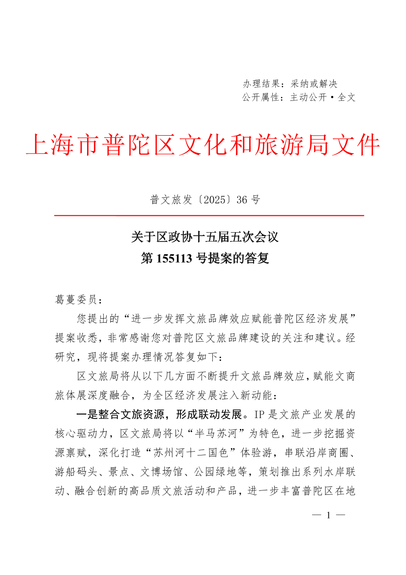 您提出的“进一步发挥文旅品牌效应赋能普陀区经济发展”提案收悉,非常感谢您对普陀区文旅品牌建设的关注和建议。经研究,现将提案办理情况答复如下: