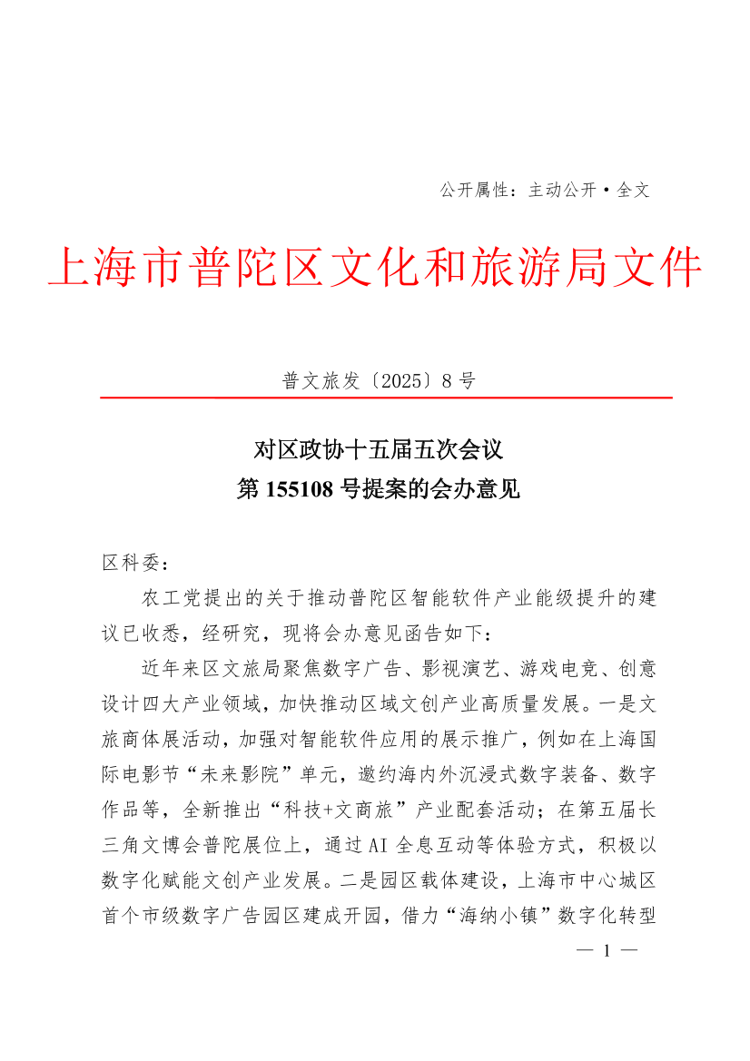 农工党提出的关于推动普陀区智能软件产业能级提升的建议已收悉,经研究,现将会办意见函告如下:
