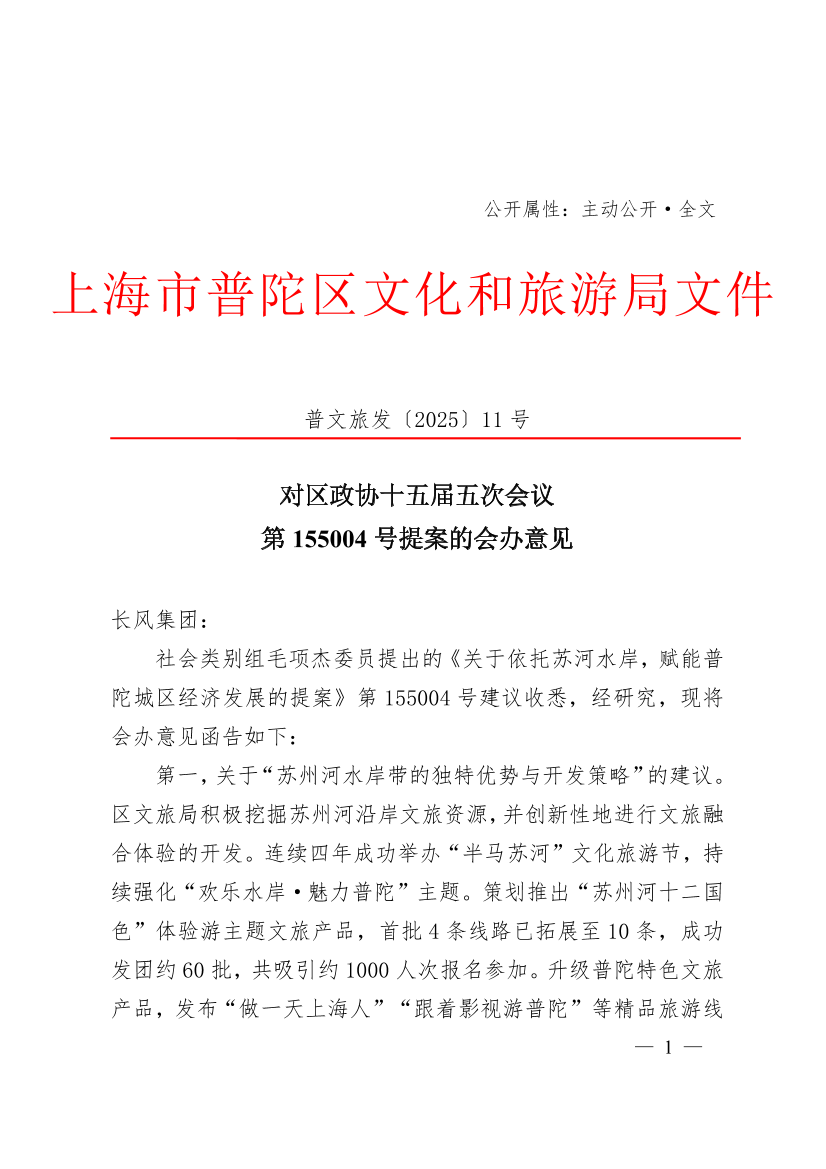 社会类别组毛项杰委员提出的《关于依托苏河水岸,赋能普陀城区经济发展的提案》第155004号建议收悉,经研究,现将会办意见函告如下: