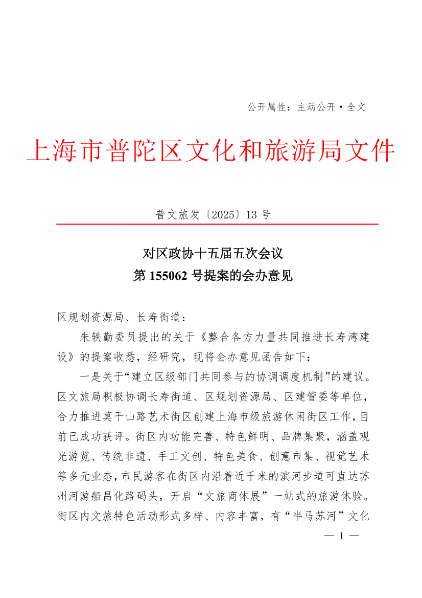 一是关于“建立区级部门共同参与的协调调度机制”的建议。区文旅局积极协调长寿街道、区规划资源局、区建管委等单位,合力推进莫干山路艺术街区创建上海市级旅游休闲街区工作,目前已成功获评。街区内功能完善、特色鲜明、品牌集聚,涵盖观光游览、传统非遗、手工文创、特色美食、创意市集、视觉艺术等多元业态,市民游客在街区内沿着近千米的滨河步道可直达苏州河游船昌化路码头,开启“文旅商体展”一站式的旅游体验。街区内文旅特色活动形式多样、内容丰富,有“半马苏河”文化旅游节、苏州河半程马拉松赛、M50当代艺术周、千树艺术市集、苏州河沿岸市集等一批颇具影响力的特色化、主题化、常态化活动。下一步,区文旅局将结合长寿湾城市更新项目整体推进,协同规资、建管、绿容等相关部门,长寿街道和街区内企事业单位,进一步优化街区基础设施建设,着力提升文旅公共服务品质,全力升级打造更具特色和人气的文商旅体展融合业态,持续构建“游船+”“演艺+”“展览+”等更多文旅消费场景。