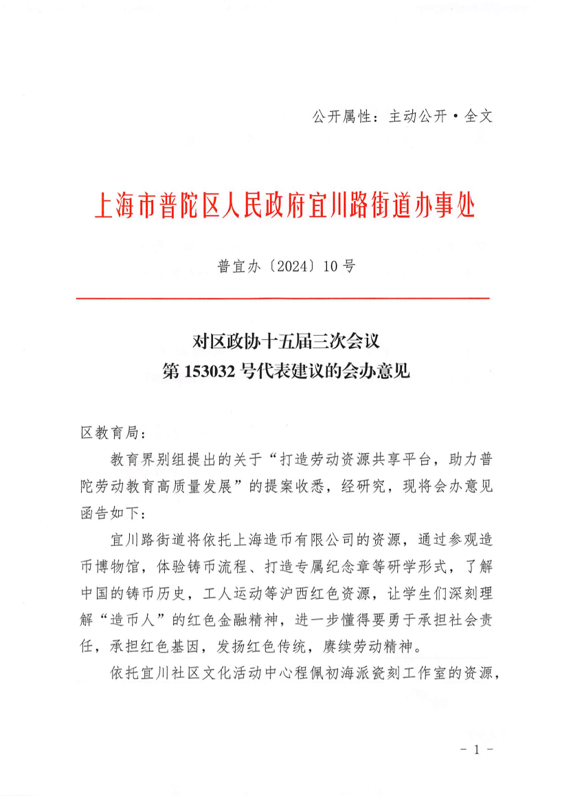 教育界别组提出的关于“打造劳动资源共享平台,助力普陀劳动教育高质量发展”的提案收悉,经研究,现将会办意见函告如下: