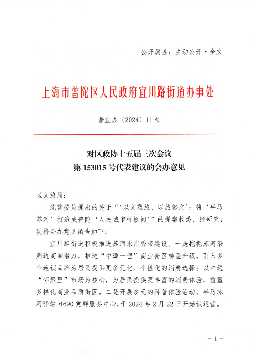 沈霄委员提出的关于“‘以文塑旅、以旅彰文’:将‘半马苏河’打造成普陀‘人民城市样板间’”的提案收悉,经研究,现将会办意见函告如下: