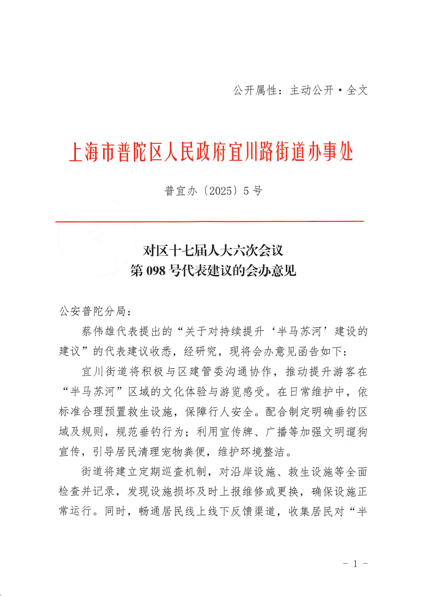 蔡伟雄代表提出的“关于对持续提升‘半马苏河’建设的建议”的代表建议收悉,经研究,现将会办意见函告如下: