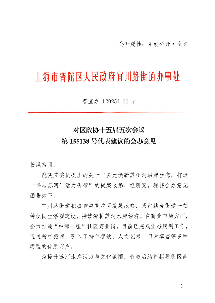 倪晓芳委员提出的关于“多元焕新苏州河沿岸生态,打造‘半马苏河’活力秀带”的提案收悉,经研究,现将会办意见函告如下: