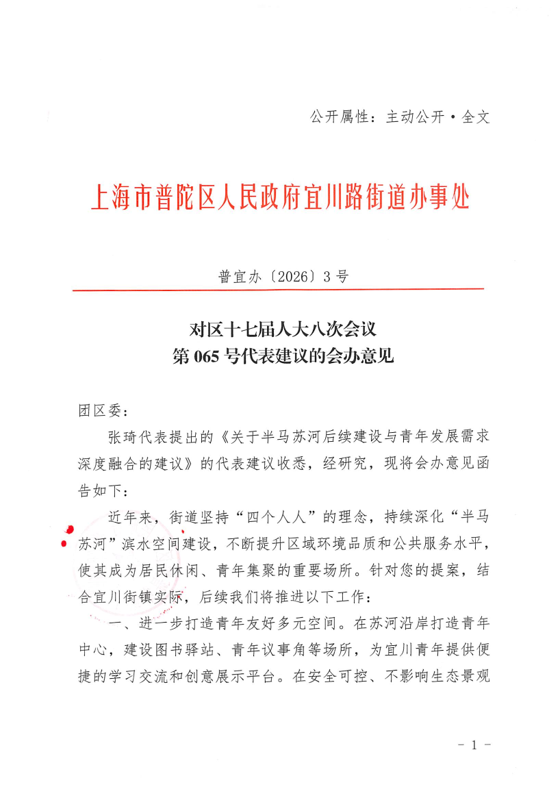 张琦代表提出的《关于半马苏河后续建设与青年发展需求深度融合的建议》的代表建议收悉,经研究,现将会办意见函告如下: