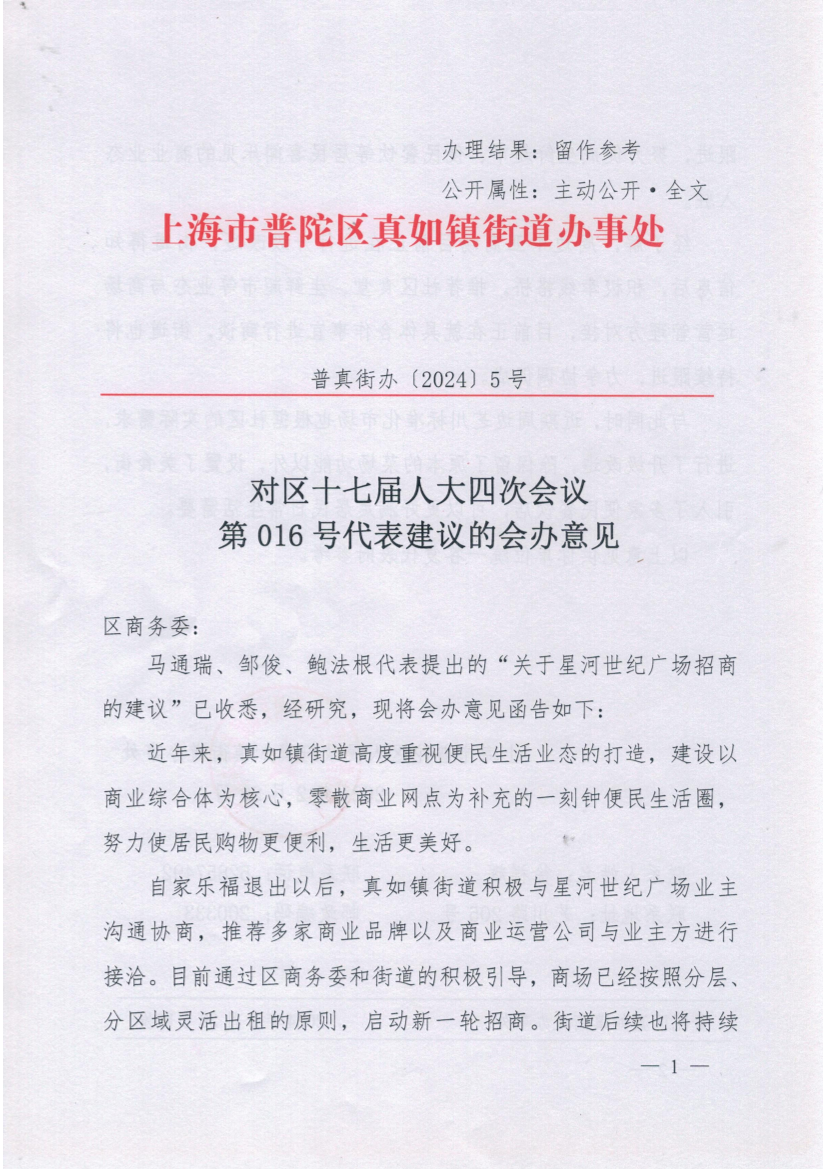 马通瑞、邹俊、鲍法根代表提出的“关于星河世纪广场招商的建议”已收悉,经研究,现将会办意见函告如下: