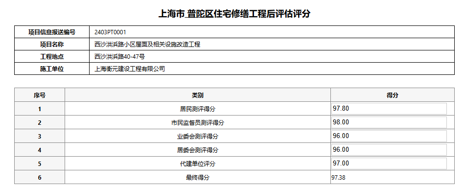 关于西沙洪浜路小区屋面及相关设施改造工程后评估考核公示