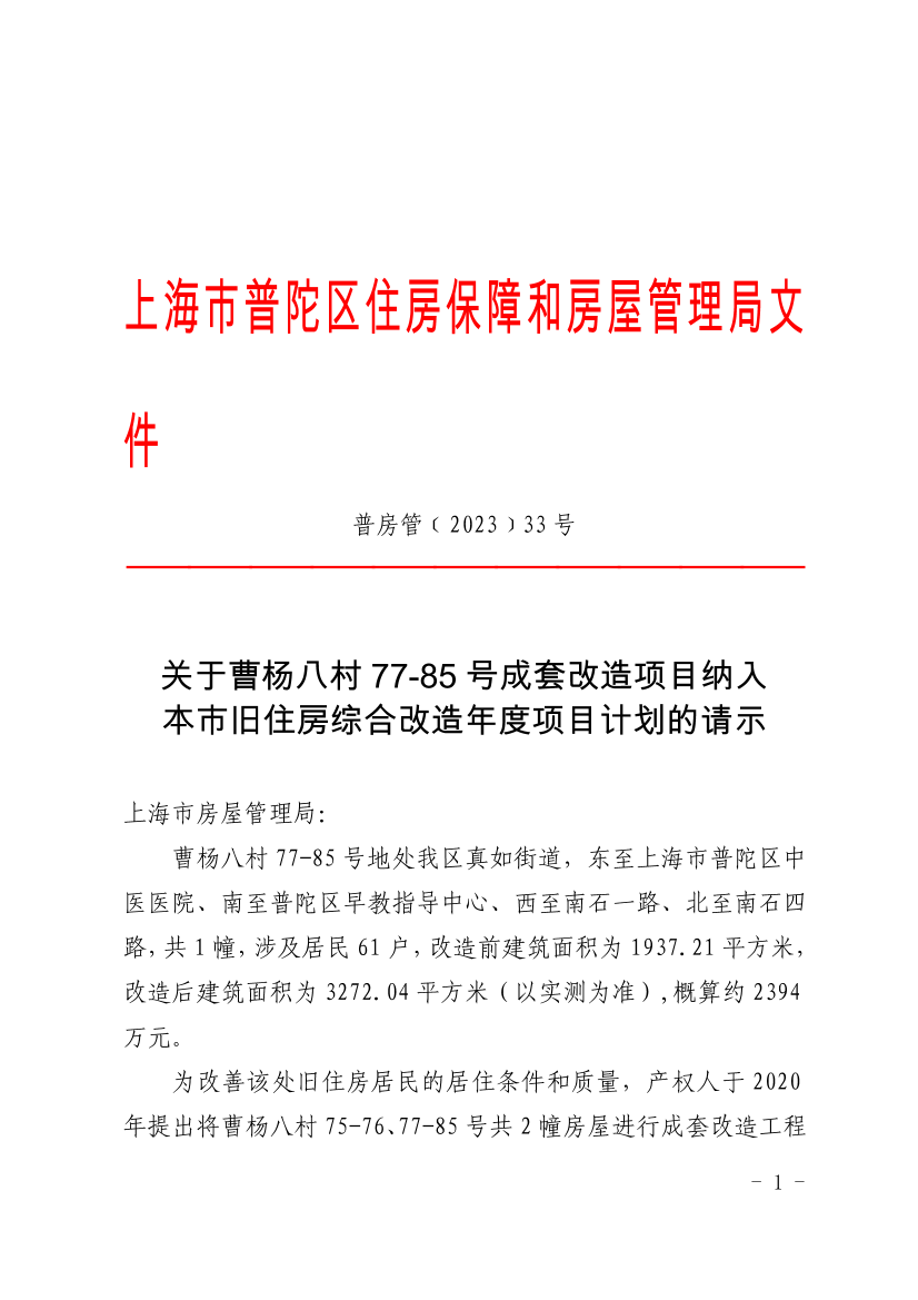 为改善该处旧住房居民的居住条件和质量,产权人于2020年提出将曹杨八村75-76、77-85号共2幢房屋进行成套改造工程的申请,并于2023年对该项目进行了投资额、改造后面积、户数的调整。经对产权人提出的曹杨八村77-85号成套改造项目立项申请相关材料及其它情况进行了审核,我局同意对上述旧住房以贴扩建+加层+整体性结构修缮+加装电梯的改造方式进行成套改造,项目概算约2394万元(普房管〔2023〕29号),已下达实施计划。