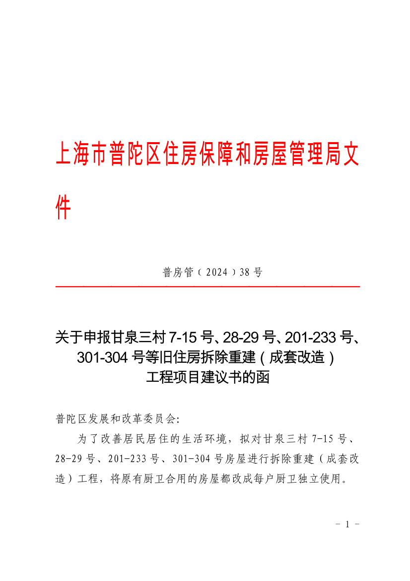 关于申报甘泉三村7-15号、28-29号、201-233号、301-304号等旧住房拆除重建(成套改造)工程项目建议书的函