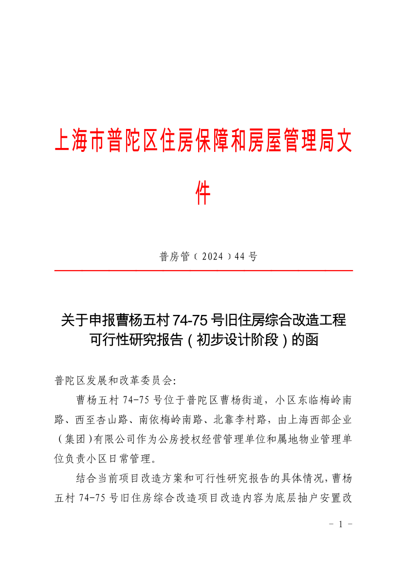 关于申报曹杨五村74-75号旧住房综合改造工程可行性研究报告(初步设计阶段)的函