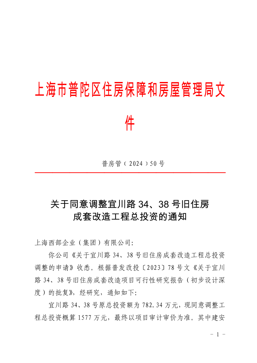 你公司《关于宜川路34、38号旧住房成套改造工程总投资调整的申请》收悉。根据普发改投〔2023〕78号文《关于宜川路34、38号旧住房成套改造项目可行性研究报告(初步设计深度)的批复》,经研究,通知如下: