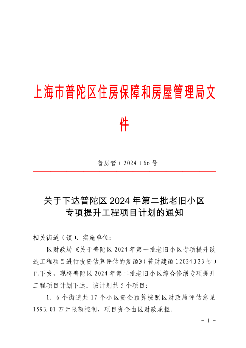 区财政局《关于普陀区2024年第一批老旧小区专项提升改造工程项目进行投资估算评估的复函》(普财建函〔2024〕23号)已下发,现将普陀区2024年第二批老旧小区综合修缮专项提升工程项目计划下达。该计划共5个项目: