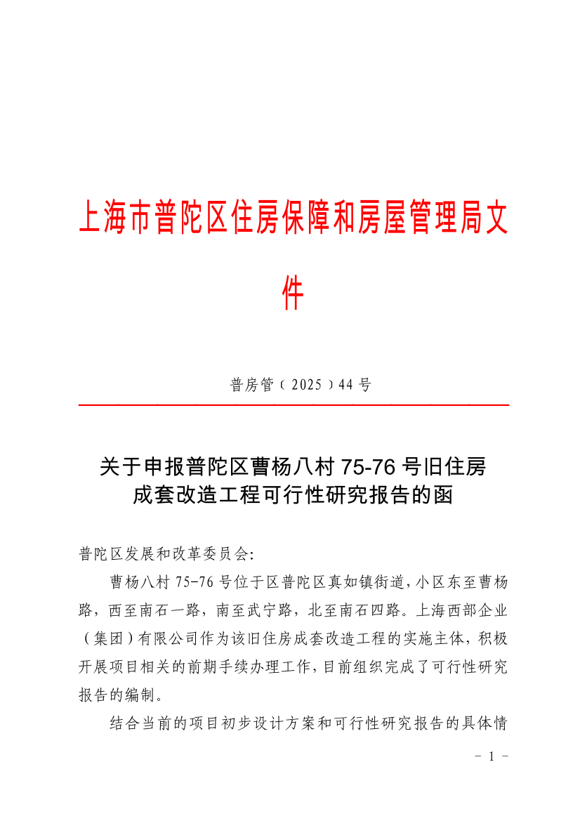 关于申报普陀区曹杨八村75-76号旧住房成套改造工程可行性研究报告的函