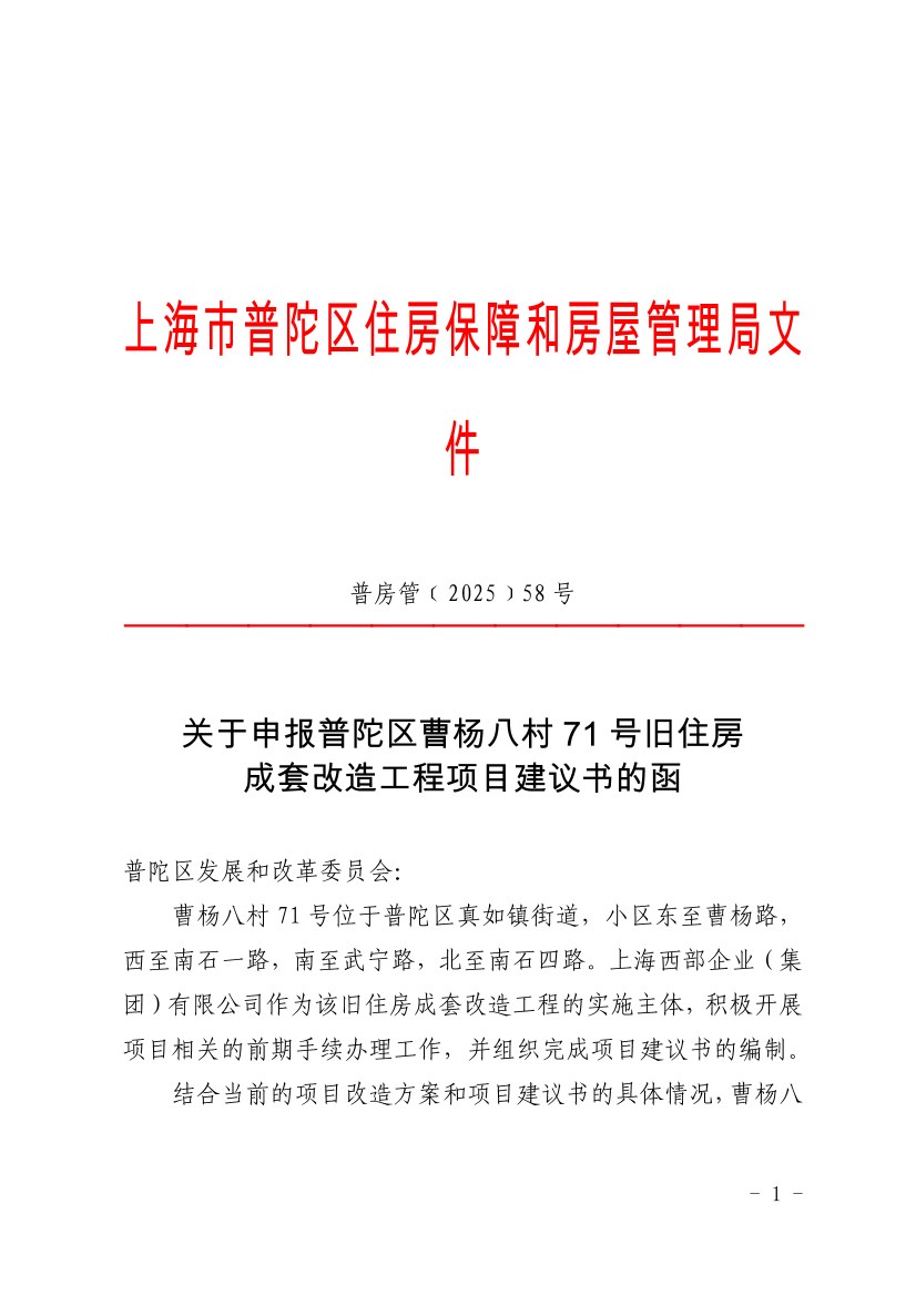 关于申报普陀区曹杨八村71号旧住房成套改造工程项目建议书的函