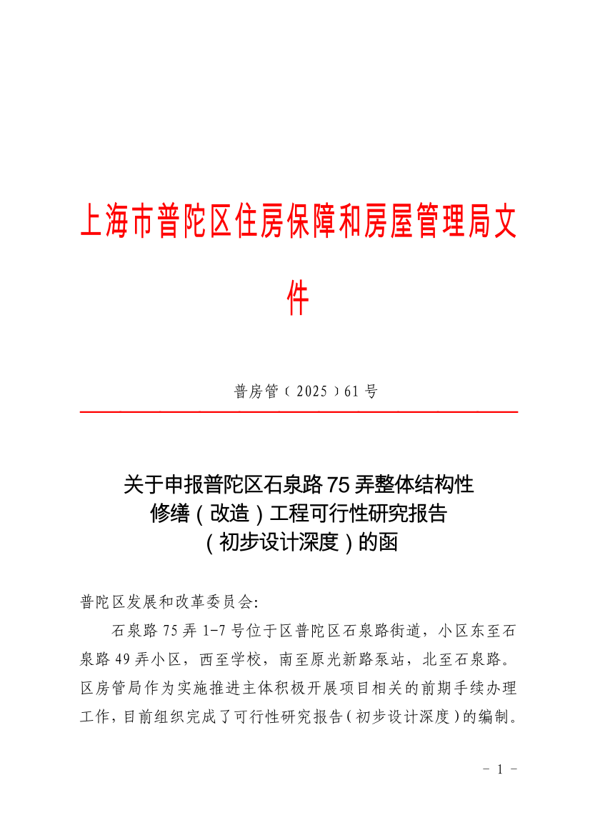 关于申报普陀区石泉路75弄整体结构性修缮(改造)工程可行性研究报告(初步设计深度)的函