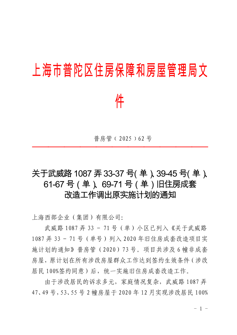 基于上述情况,经研究决定,武威路1087弄33 - 37号(单)、39 - 45号(单)、61 - 67号(单)、69 - 71号(单)(4幢)旧住房成套改造工作调出《关于武威路1087弄33 - 71号(单号)列入2020年旧住房成套改造项目实施计划的通知》普房管(2020)73号。请你公司按照《上海市旧住房综合改造管理办法》要求,做好武威路1087弄47、49号,53、55号(2幢)已完成改造居民后续产证办理等项目建设流程闭环工作。