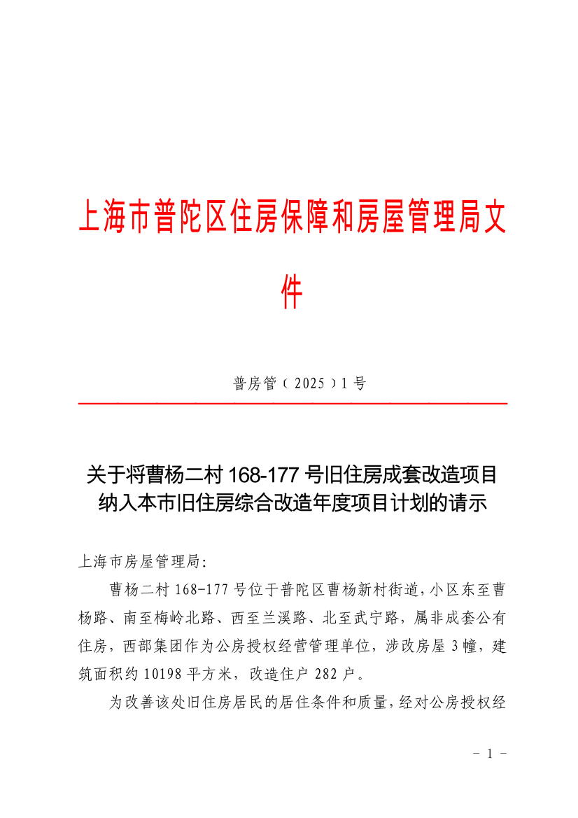 关于将曹杨二村168-177号旧住房成套改造项目纳入本市旧住房综合改造年度项目计划的请示