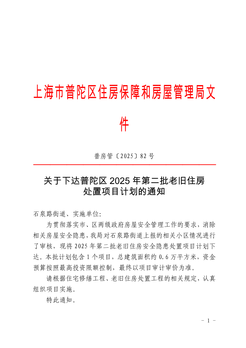 关于下达普陀区2025年第二批老旧住房处置项目计划的通知