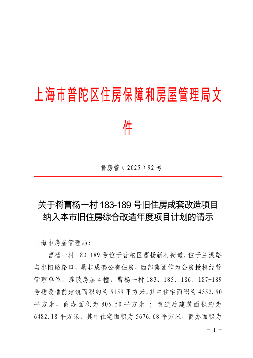 关于将曹杨一村183-189号旧住房成套改造项目纳入本市旧住房综合改造年度项目计划的请示