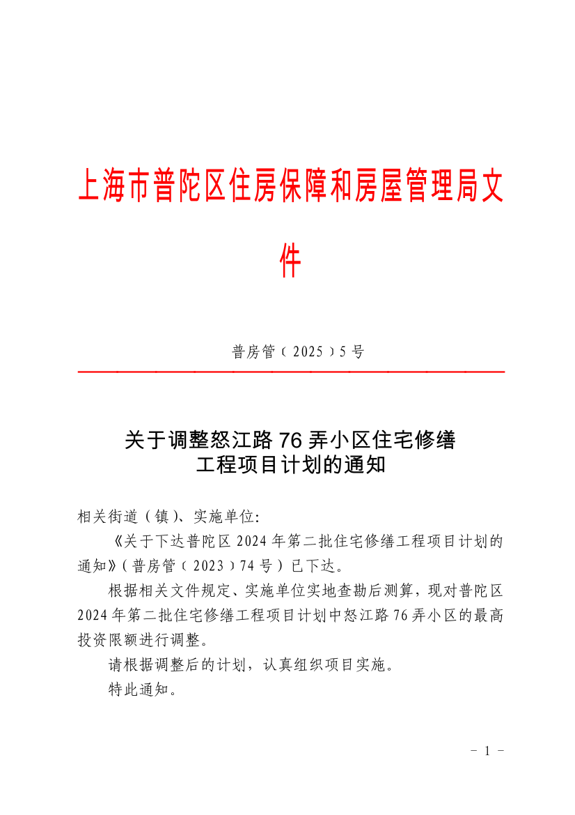 关于调整怒江路76弄小区住宅修缮工程项目计划的通知
