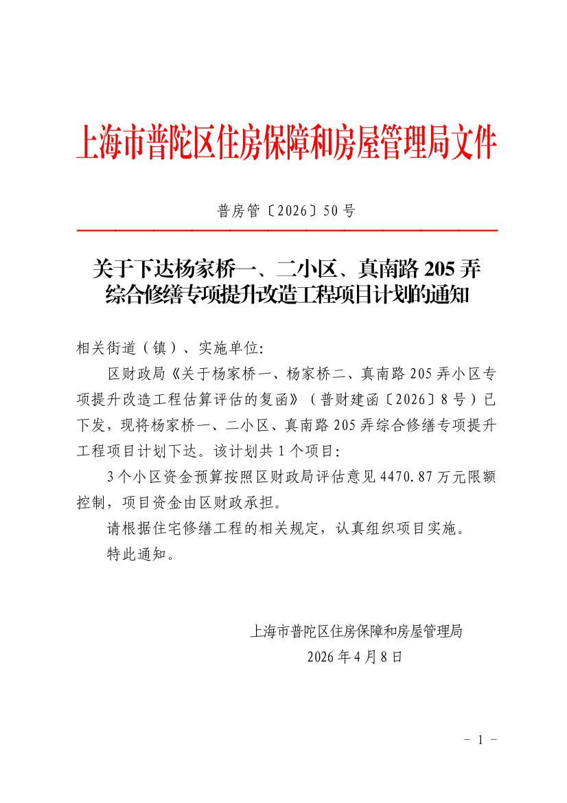 区财政局《关于杨家桥一、杨家桥二、真南路205弄小区专项提升改造工程估算评估的复函》(普财建函〔2026〕8号)已下发,现将杨家桥一、二小区、真南路205弄综合修缮专项提升工程项目计划下达。该计划共1个项目: