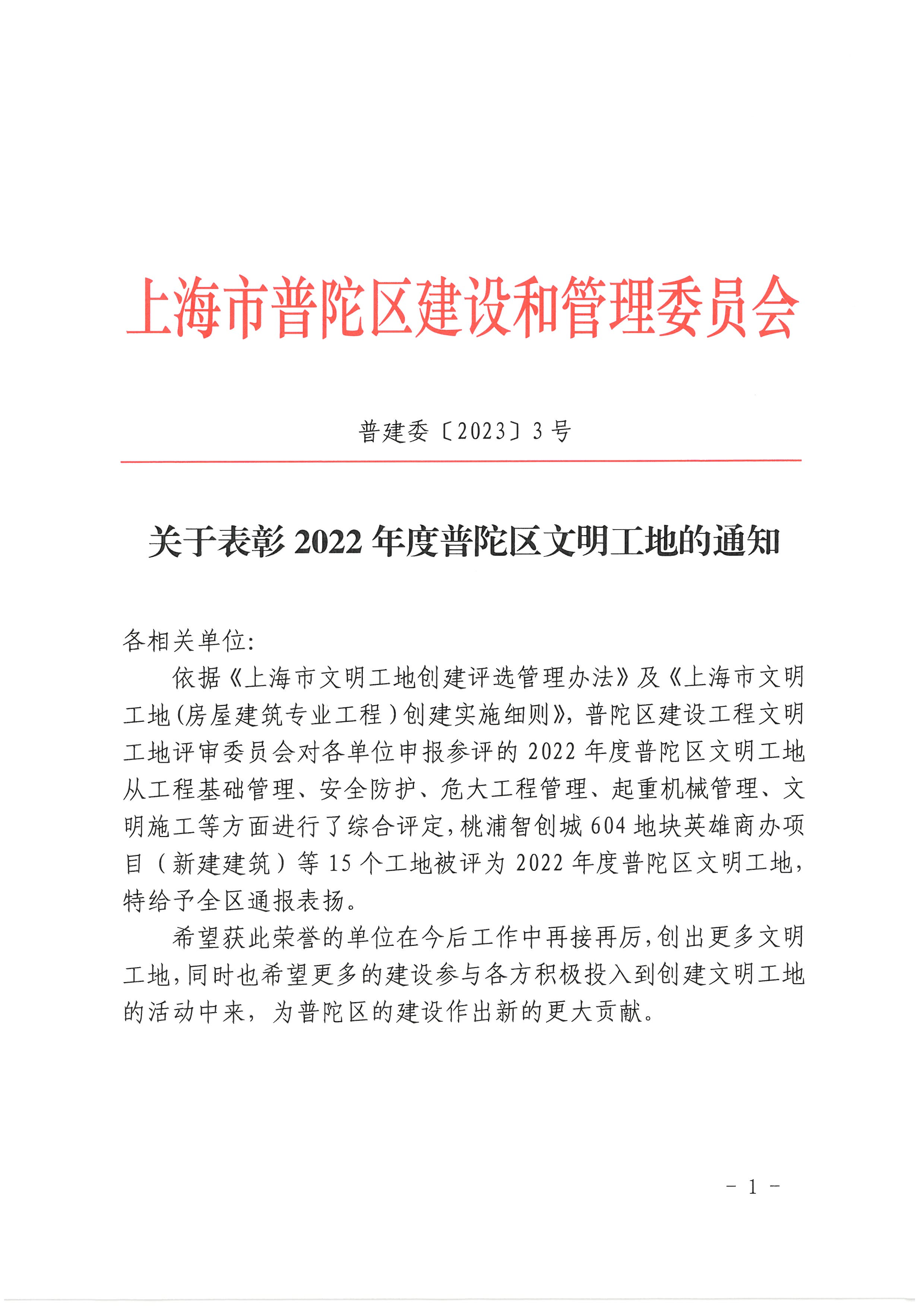 依据《上海市文明工地创建评选管理办法》及《上海市文明工地(房屋建筑专业工程)创建实施细则》,普陀区建设工程文明工地评审委员会对各单位申报参评的2022年度普陀区文明工地从工程基础管理、安全防护、危大工程管理、起重机械管理、文明施工等方面进行了综合评定,桃浦智创城604地块英雄商办项目(新建建筑)等15个工地被评为2022年度普陀区文明工地,特给予全区通报表扬。
