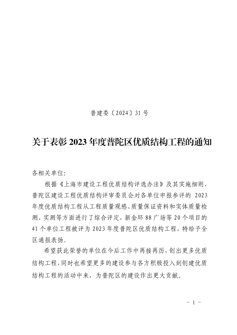 根据《上海市建设工程优质结构评选办法》及其实施细则,普陀区建设工程优质结构评审委员会对各单位申报参评的2023年度优质结构工程从工程质量观感、质量保证资料和实体质量检测、实测等方面进行了综合评定,新金环88广场等20个项目的41个单位工程被评为2023年度普陀区优质结构工程,特给予全区通报表扬。